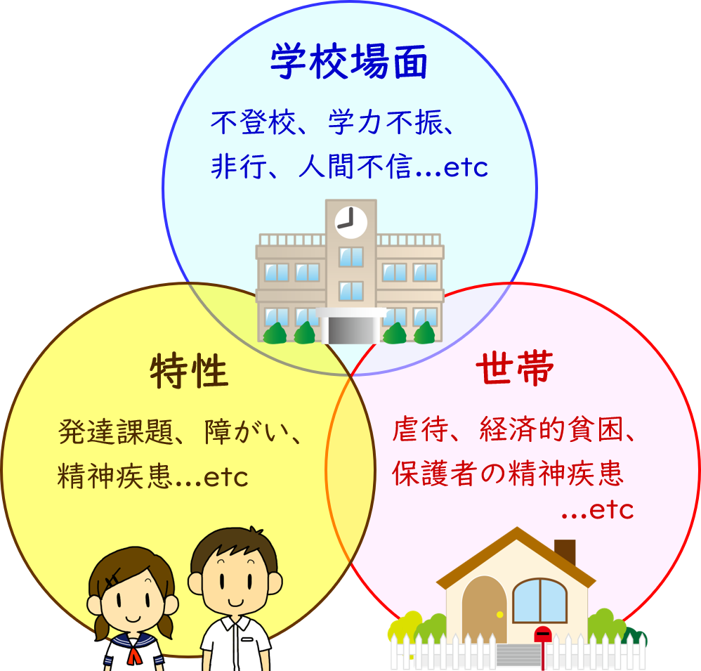 家庭訪問等を通じて世帯の状況やご本人の特性・学校や家庭での様子を聞き取ります。