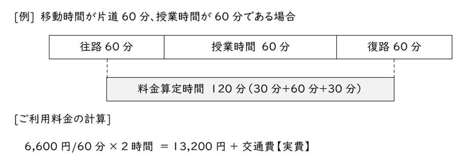 また、訪問型で「片道30分を超える遠方」での学習支援を希望される場合、30分を超える移動時間分を授業時間に加算した料金になります。