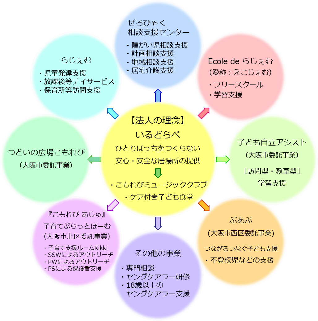 こもれびでは、「障がい児や障がい者を対象とした相談支援」をはじめ、「放課後等デイサービスなど」の運営、主に不登校の子どもたちを対象とした「フリースクール」や「訪問型学習支援」など、さまざまな課題を抱える子どもたちの支援を中心に事業を展開しています。また、高齢者の介護については、居宅介護事業所として介護プランの作成などもおこなっています。