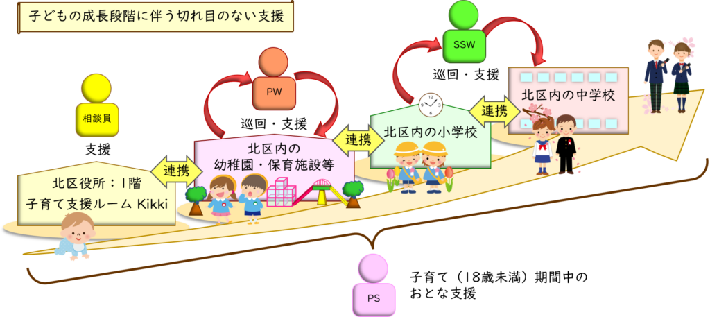 プレスクールワーカー(PW)が北区内の幼稚園、保育施設などへ定期的に巡回し、課題を抱える子どもの発見と速やかな相談・適切なアドバイス、情報連携などをおこなっています。